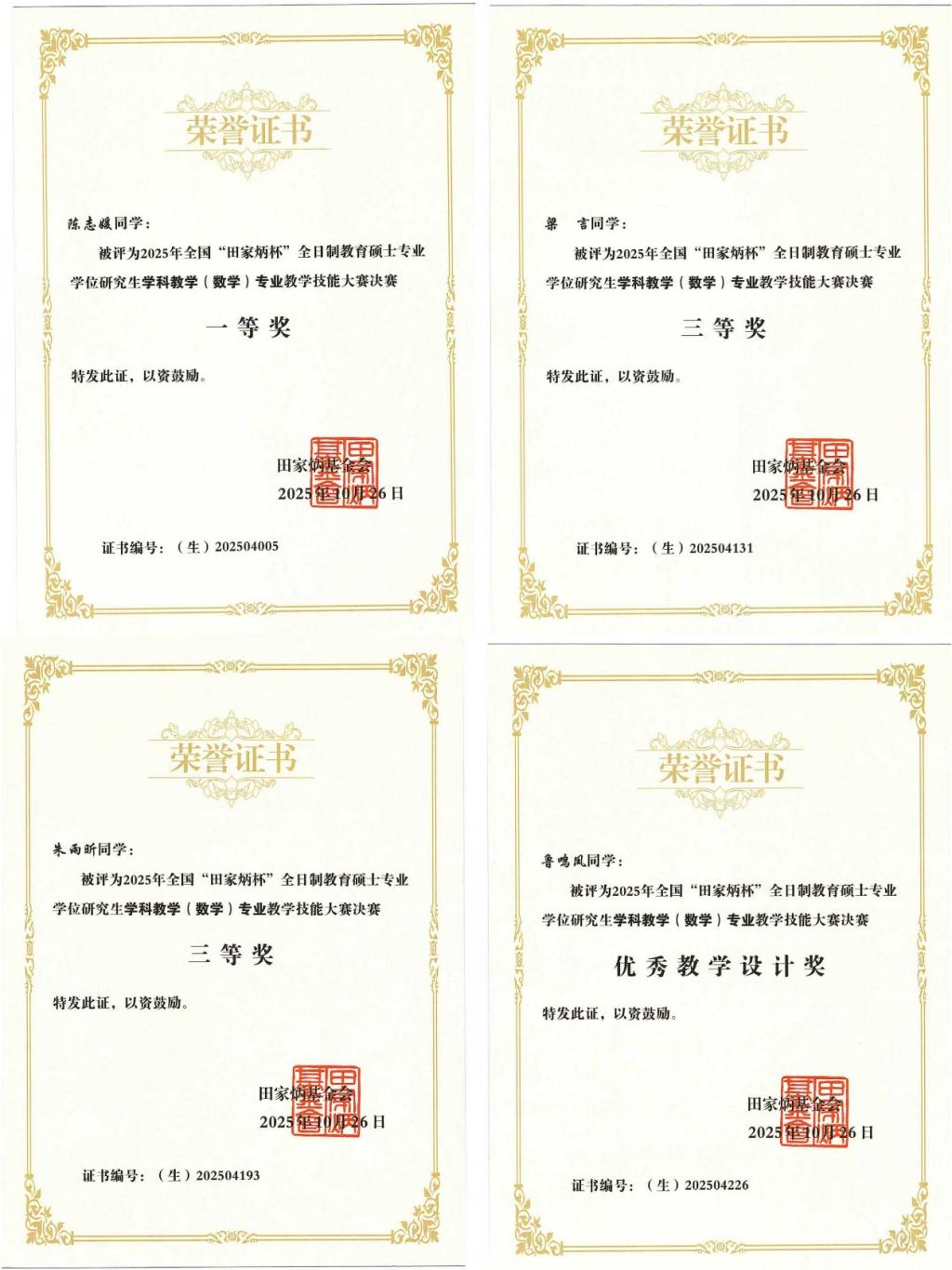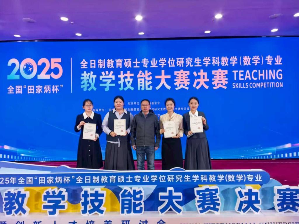 近日,2025年全国“田家炳杯”全日制教育硕士专业学位研究生学科教学(数学)专业教学技能大赛决赛在西华师范大学举行。经过激烈角逐,我校数学与统计学院学科教学(数学)专业研究生陈志媛获一等奖,梁言、朱雨昕获三等奖,鲁鸣凤获优秀教学设计奖,数学与统计学院教师彭燕伟博士获“优秀指导教师”奖。