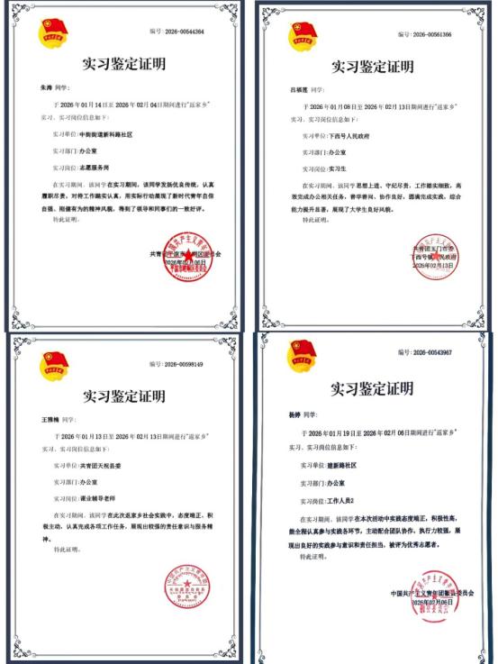 为深入学习贯彻习近平总书记关于青年工作的重要思想,引导青年学子在社会实践中受教育、长才干、作贡献,将个人成长融入家乡发展大局,2026 年寒假期间,我院27名学生参加了“返家乡”社会实践活动,奔赴基层一线,在政务实践、社区服务、文化传承、乡村振兴等岗位上躬身实干,以青春之力书写家乡发展答卷。
