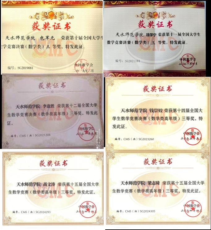 学院高度重视学生实践能力的培养,组织学生积极参加各类专业学科竞赛活动,并取得了较好的成绩。在全国大学生数学竞赛中共获得全国决赛三等奖7项,甘肃赛区奖励479项(其中一等奖107项、二等奖149项、三等奖223项),自2013年以来,在全国大学生数学竞赛中连续在甘肃赛区非重点院校名列前茅。近年来,我院本科生和研究生在全国田家炳杯全日制教育硕士专业学位研究生学科教学(数学)教学技能大赛、甘肃省师范生教学技能大赛、全国师范生微课大赛、华文杯高校数学师范生教学技能测试+微课大赛等竞赛中取得良好的成绩,获得一、二、三等奖分别为12项、30项、8项。同时,学院着力打造了“数学文化节”和“卓越教师技能大赛”等校园学生品牌活动,为学生提供了展示才华的广阔舞台,强化了学生的职业技能,提高了学生的专业素养。